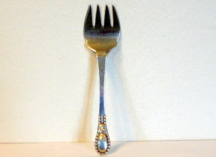Evald Nielsen sardingaffel - varenr. 1846Sardingaffel i hammerslået sølv. L. 14 cm. Gaflen er mærket Evald Nielsen. 830. Anno 1922.Pris: Kr. 375,-